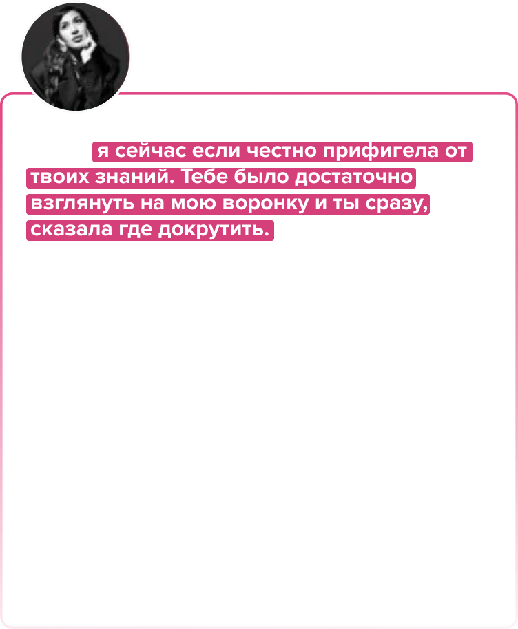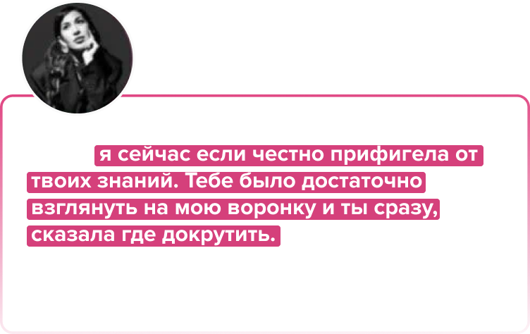Эксперта целенаправленно искала в этой нише. Важно было одно, чтобы он реально был сильным экспертом с опытом и давал ученикам результат. Соцсети и охваты не имели значения, но если в цифрах, то охваты в запрещенной соц.сети были 30. Эксперт до этого никогда не вел вебинары и не выступал на аудиторию. Но это не помешало нам, она со временем всему научилась. Мы все подготовили, протестировали и постоянно докручивали. Первый запуск – 1,2 млн. с чистой прибылью более 50%. Потом мы сделали х 2. Несмотря на СВО, удержались и выросли до 10 млн./мес. Наш проект тогда еще победил на “Прорыве” у Тани Маричевой..